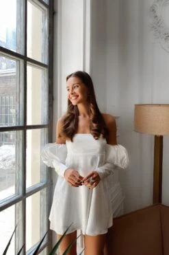 Alessi is so cute & feminine. This mini dress has a straight neckline, off-shoulder puff statement sleeves & a-line skirt. Made from silky satin fabric with delicate floral detailing all over.