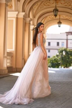 Semi-sheer beaded mesh fabric, lined with nude mesh fabric, no boning, zip back, back slit, non-stretch.