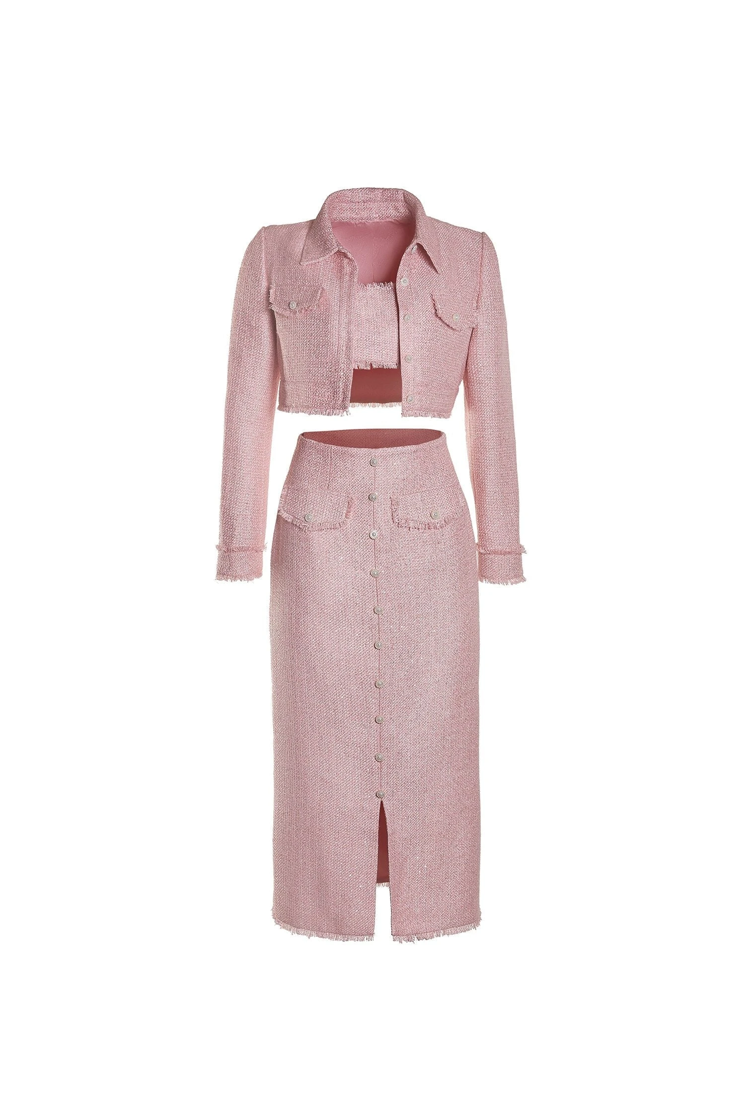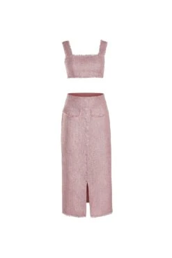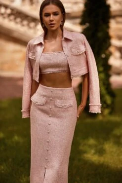 The Amina Set is the epitome of chic, this stunning set is made from shimmering pink tweed fabric and features pearl buttons and frayed edging. Mix & match with your other outfits or wear as the complete set for a feminine, pretty-in-pink yet sophisticated look.