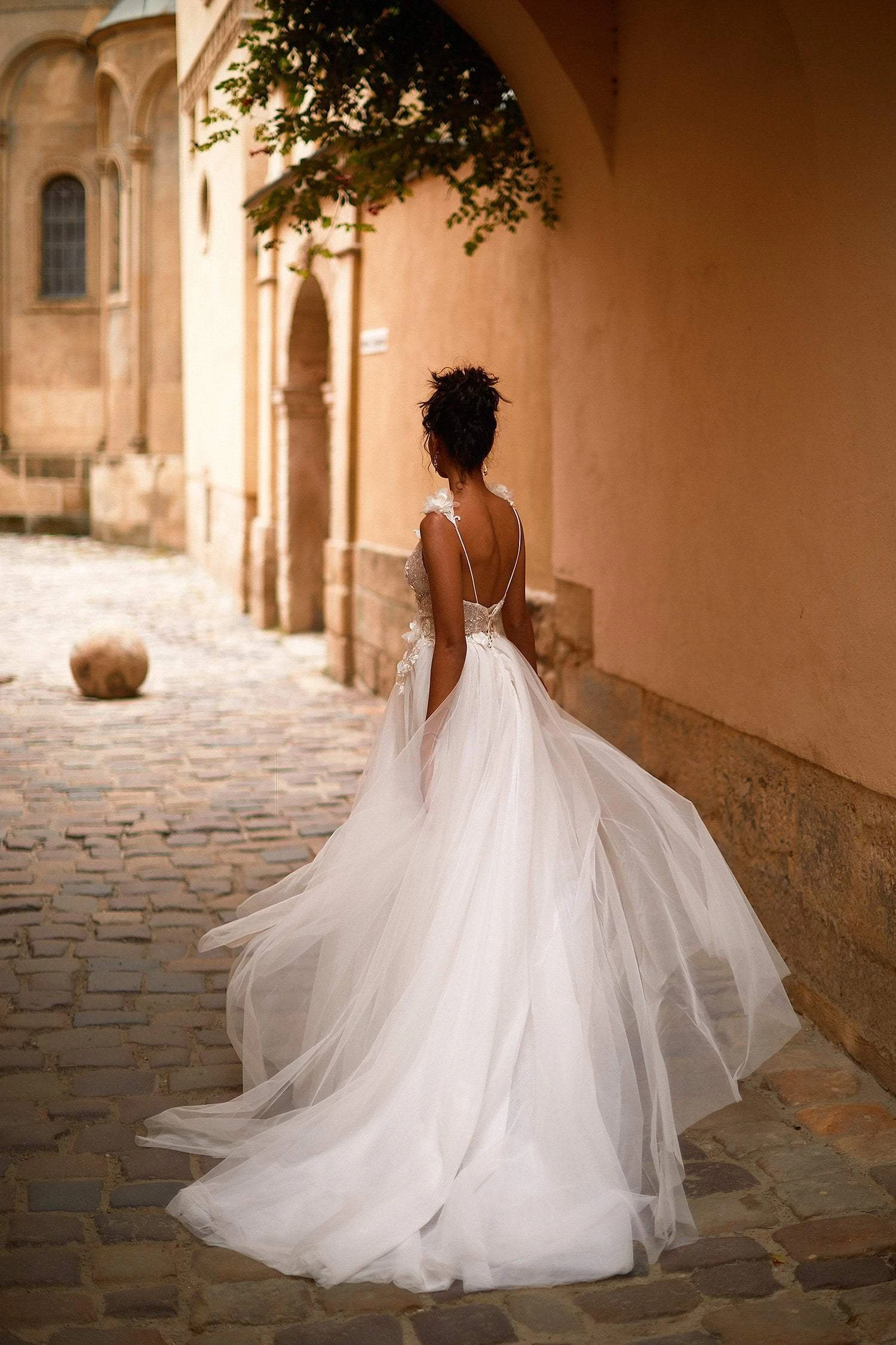 The Eliah Gown will take your wedding look to a whole new level. This gorgeous gown features a deep plunge neckline and a floral embroidered bodice with beading & sequins. Eliah also features a low back with lace-up detail, side slit with mini skirt lining and a train flowing behind.