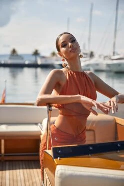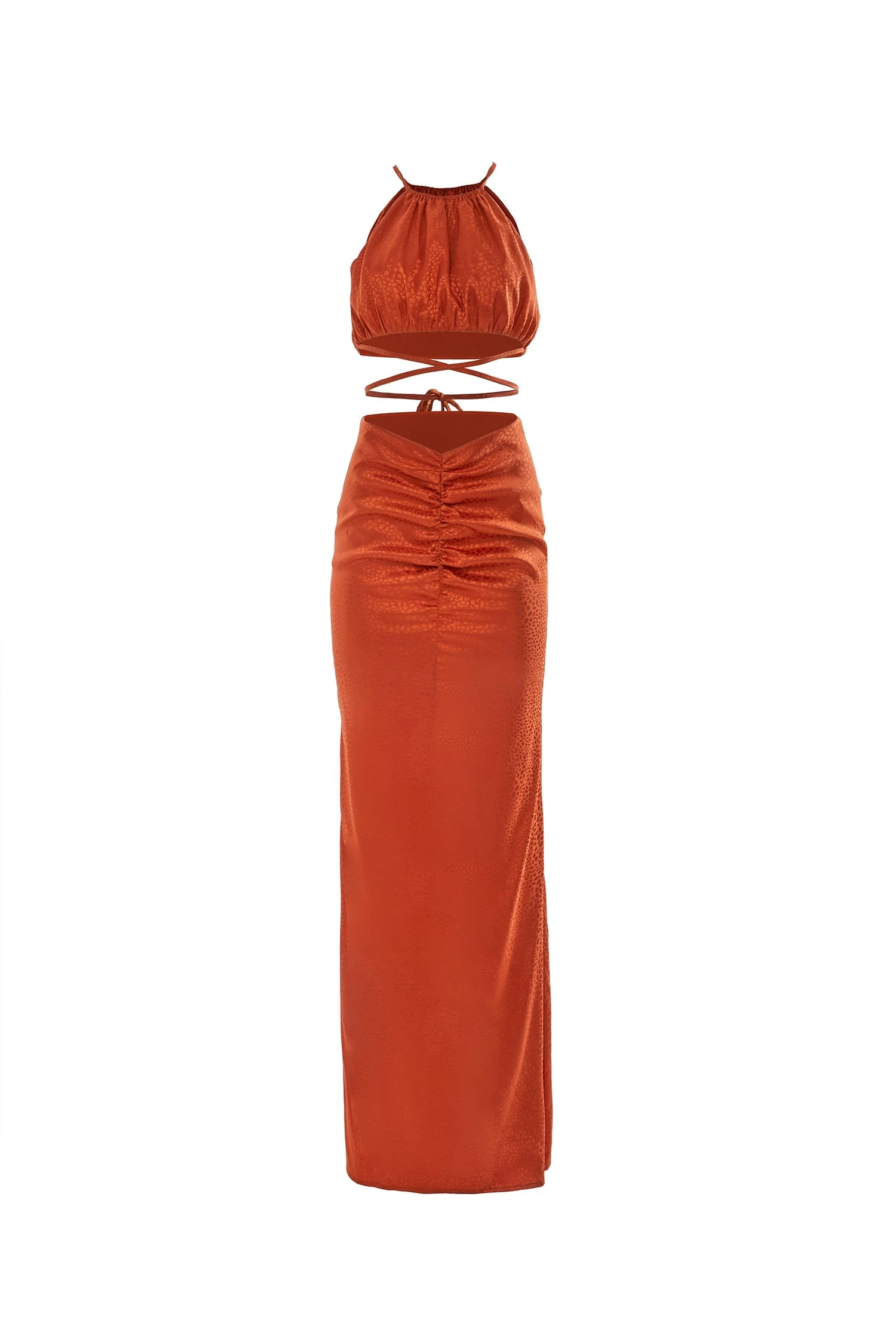 The Emilia Set provides a modern take on evening styling with its two-piece design, waist wrap, and v-shaped skirt. Rendered from an animalier textured satin in a rustic orange hue that hugs the hips and falls to a straight silhouette. The Emilia Set is the ultimate contemporary look.