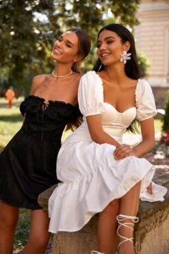 A classic must-have style. The Katina Dress is an elegant white a-line midi dress with a classic bustier, puffy sleeves & frill hemline. The perfect day dress, pair with strappy heels for an elegant chic look.