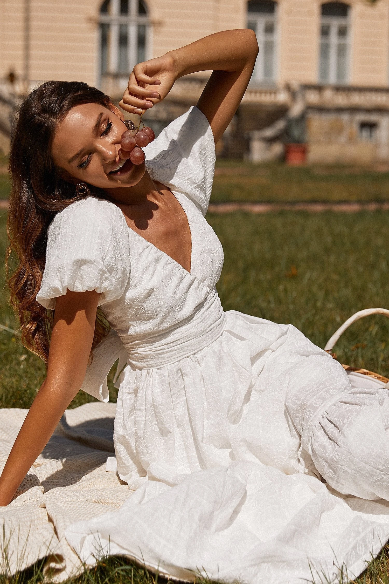 Look like an angel in this stunning white maxi dress. Lara is made from lightweight patterned lace fabric and features a v-neckline with puff sleeves & thick lace-up detachable waist band. Lara also has a flattering a-line fit with a frill hemline.