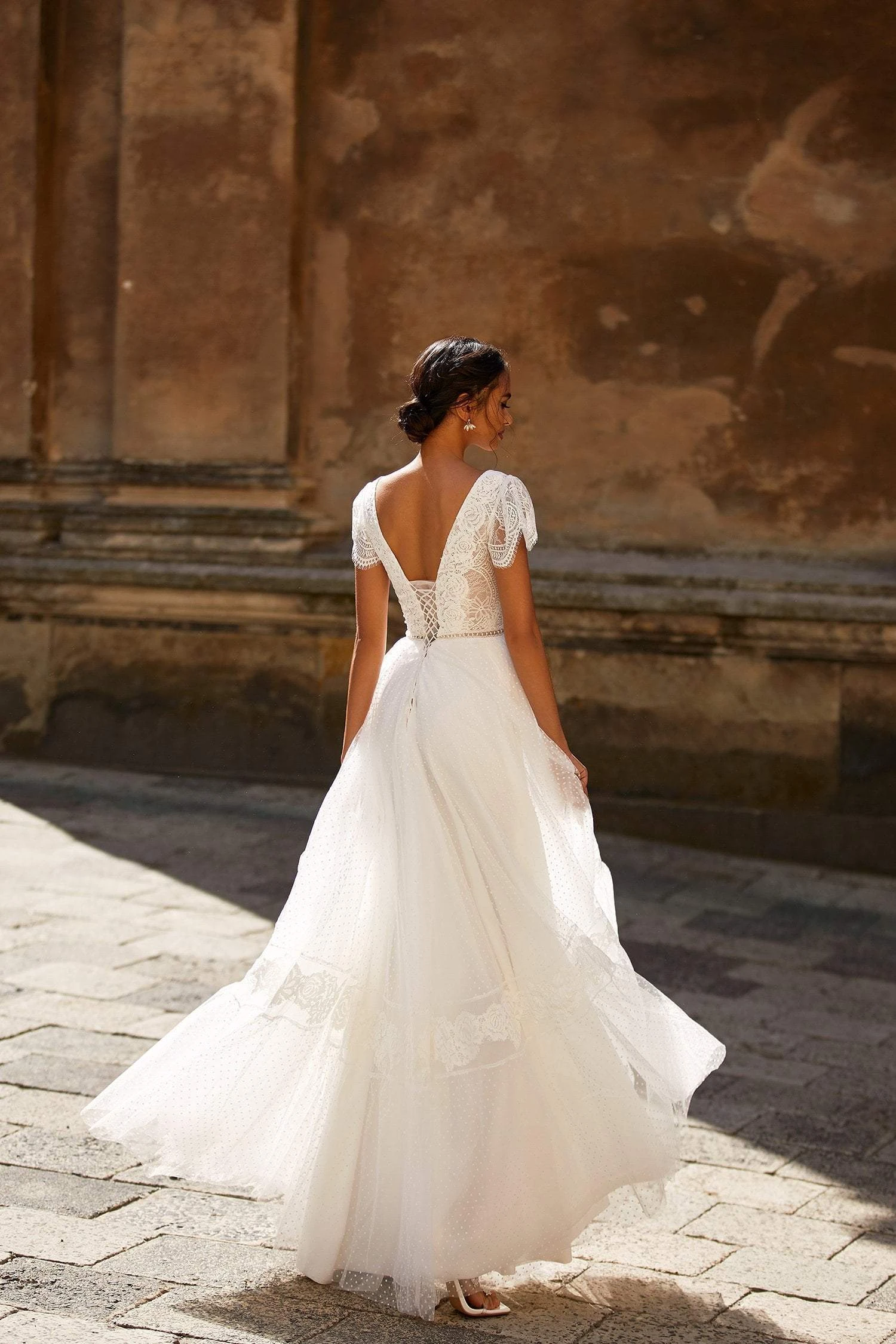 Odila is all things dreamy & classy. Feel & look like an angel on your special day in this soft, flowing lace gown. Odila features a stunning detailed lace bodice with criss-cross detailing, exposed back & a flowing a-line skirt with subtle polka dot texture.