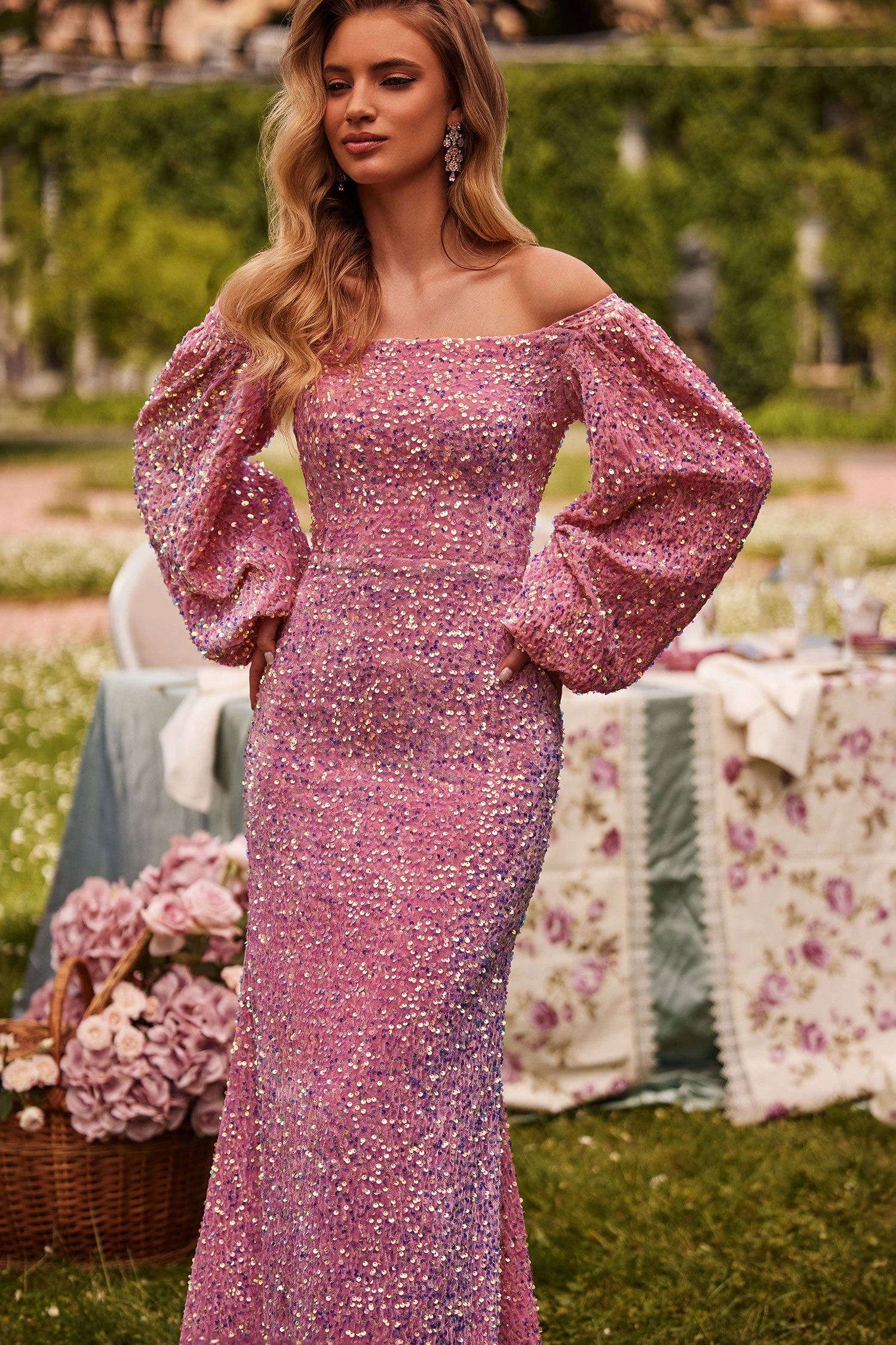 The Madison Gown takes a bright and bold approach event wear with its iridescent pink sequin fabric. Fitted with off-shoulder bishop sleeves with wrist cuffs and a straight fit that softly traces the bodies silhouette. Both modest and stylish, the Madison Gown is perfect for both wedding guests and gala attendees.