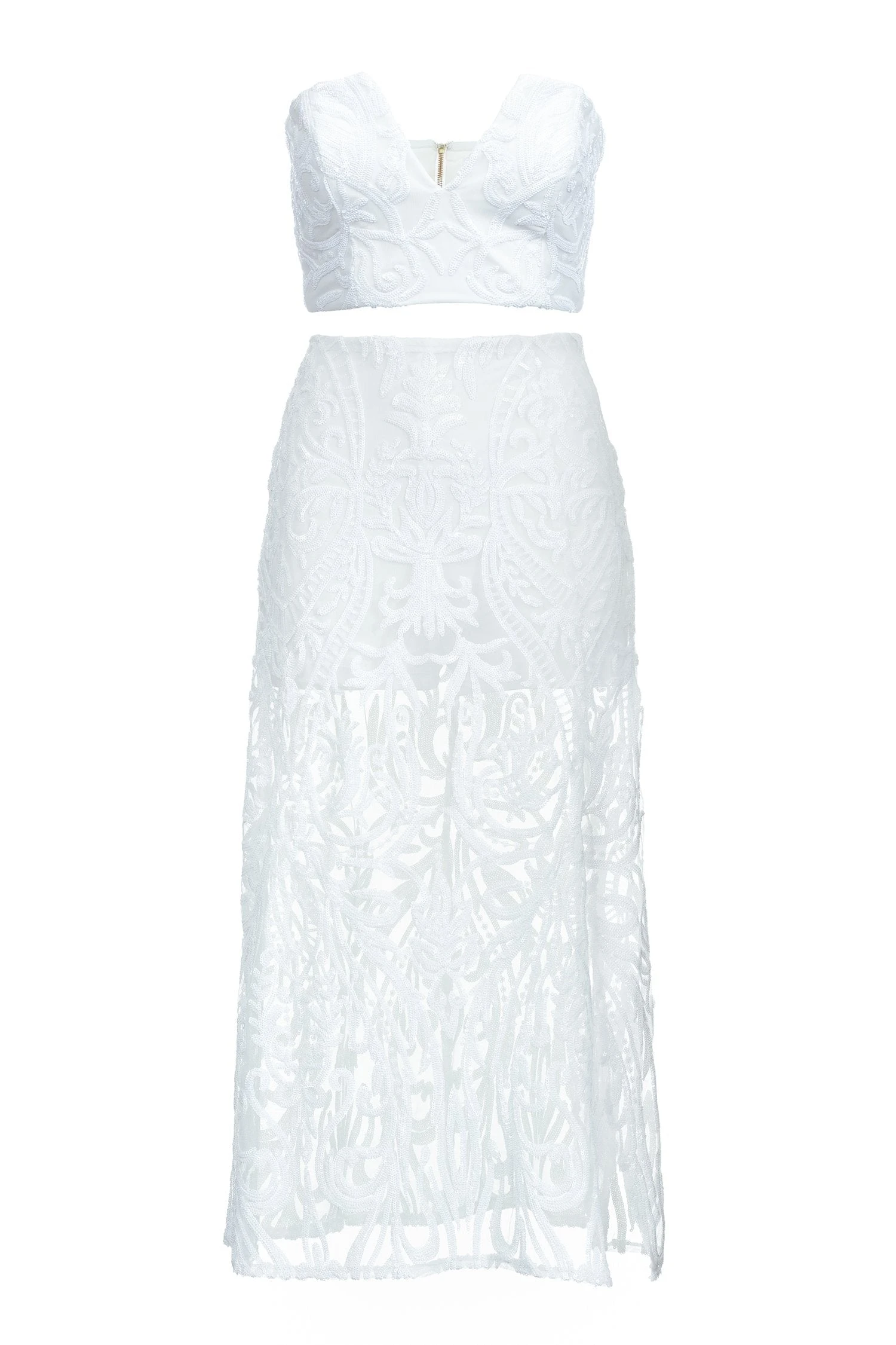 Dance the night away in the Mauris Set. Made from white sequin fabric & features a cropped strapless v-neck bustier with a matching semi-sheer midi skirt. So glamorous.