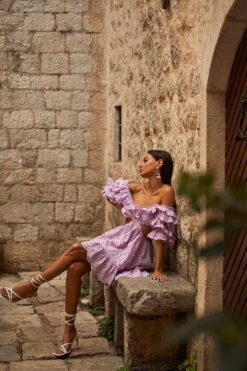 Allow your feminine side to take the forefront of your look in the Roselle Dress. Accented with frill trims and a scalloped hem, this lilac mini dress provides versatility with its sleeves that can be styled on or off the shoulder. Crafted in a luxe San Gallo lace fabric and elevated with its side cutouts and voluminous a-line skirt. The Roselle Dress has an abundance of feminine details that will find you choosing it over and over again.