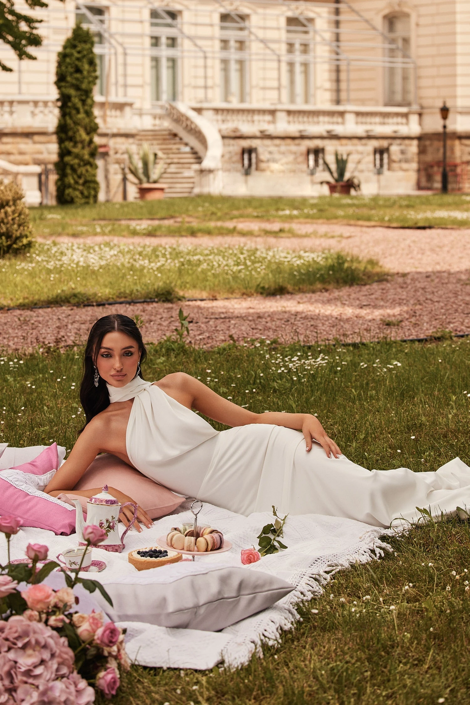 Invest in a timeless style that provides both sophistication and class. The Sofia Gown is designed with a high single shoulder neckline that is wrapped around the neck and draped down the back, a fitted skirt that hugs the hips and a mermaid train. Cut from a luxurious matte satin fabric in a soft white tone. Reinvented for the modern woman, the Sofia Gown is the epitome of luxury.