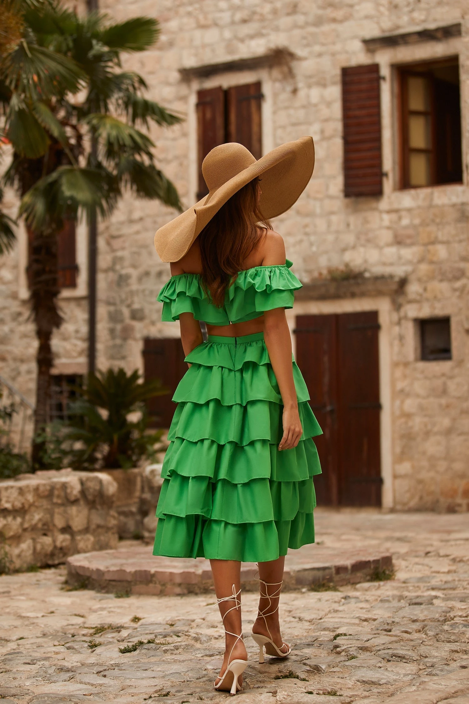 Indulge in maximalism courtesy of the Tia Set. In a bright emerald hue, with voluminous tiered ruffles, this two-piece set favours modernity. Designed with off-shoulder sleeves and an a-line skirt.